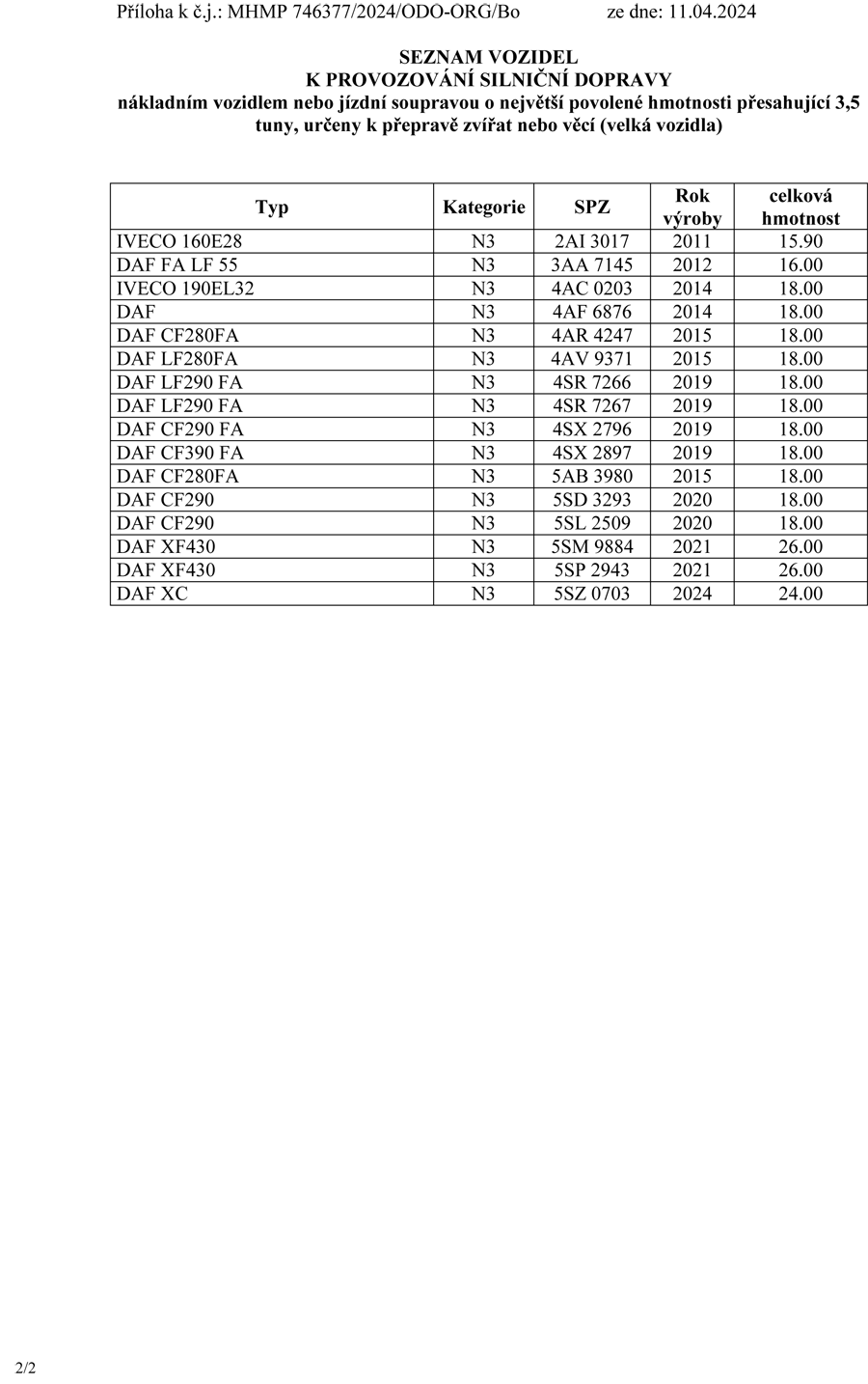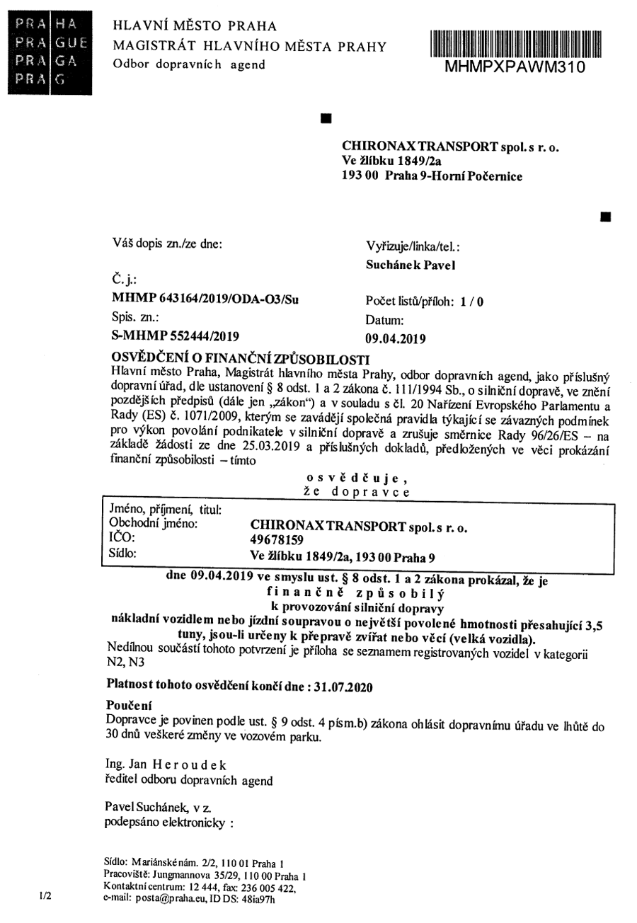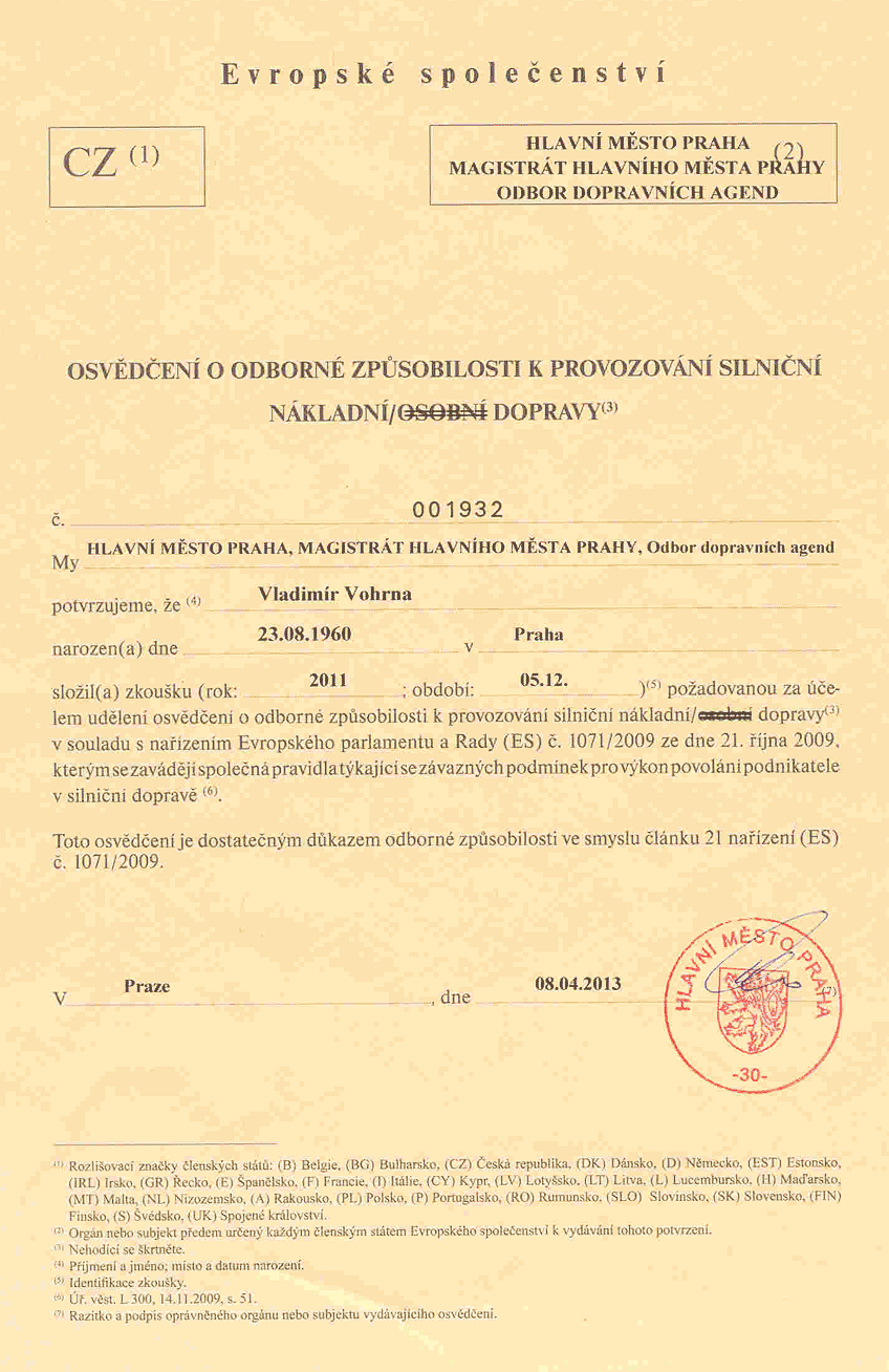 Koncesní listina pro dopravu Výpis z živnostenského rejstříku Osvědčení o finanční způsobilosti Osvědčení o finanční způsobilosti Osvědčení o odborné způsobilosti Licence pro mezinárodní přepravu